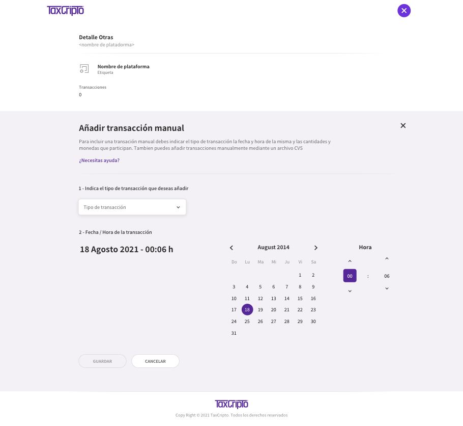 Es posible que necesite incluir unas pocas transacciones a sus plataformas y prefiera incorporarlas de forma manual. Para ello, debe acceder a la página de la plataforma en la que desea añadir transacciones y dentro de dicha plataforma, en la pestaña transacciones, se encuentra la opción añadir transacción manual.