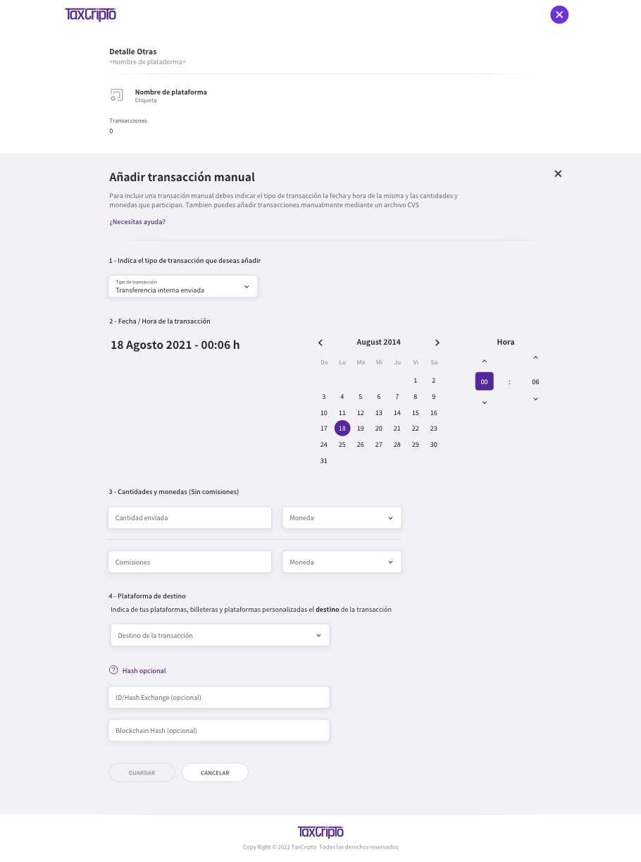 Una vez seleccionada esa opción, puede incorporar una transacción manual incluyendo los datos necesarios de dicha transacción: