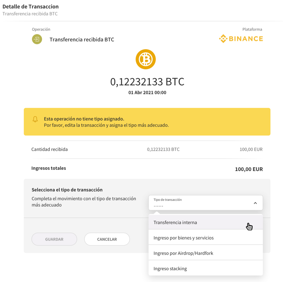 En las integraciones de transacciones mediante API, los depósitos en criptomonedas se incluyen en TaxCripto como “Entradas pendientes de clasificar” junto con el aviso “Pendiente de reclasificar”. En estos casos, es necesario que indique manualmente el tipo de transacción a la que corresponde la transferencia recibida. Es decir, deberá seleccionar entre los siguientes tipos y completar la información necesaria: