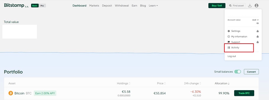 - Dentro de Bitstamp el icono de cuenta, acceder a “Activity”
