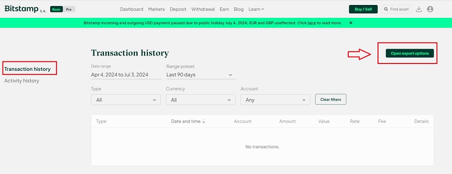- Seleccionar “Transaction History” (https://www.bitstamp.net/account/transactions/) y pulsar en «Open export options»