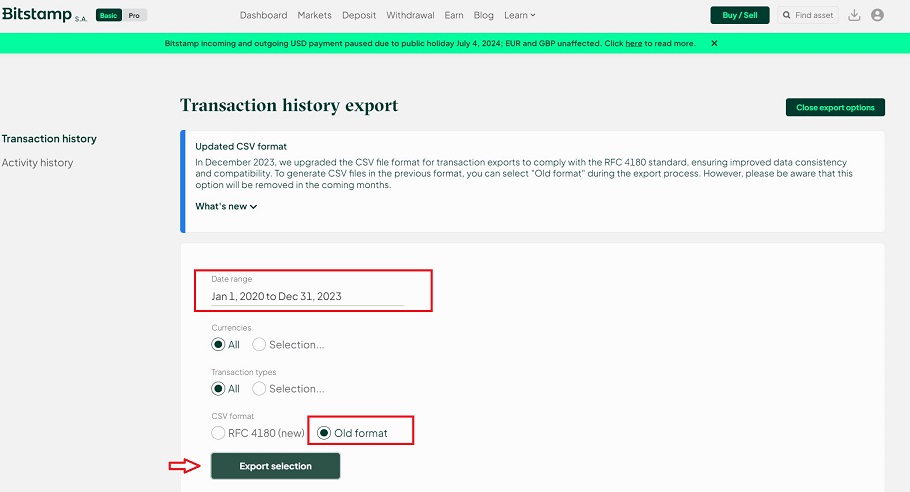 - Seleccionar el rango de fechas para mostrar el historial de transacciones, «CSV format» marque «Old format» y Exportar.