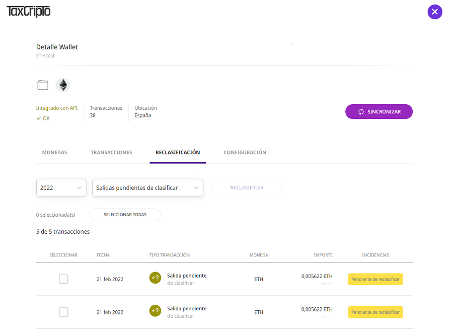 La reclasificación es definitiva y no puede deshacerse. Una vez reclasificadas, puede editar los importes asociados por TaxCripto a las criptomonedas (valoraciones en Euros) si no está de acuerdo con el valor asignado a cada transacción.