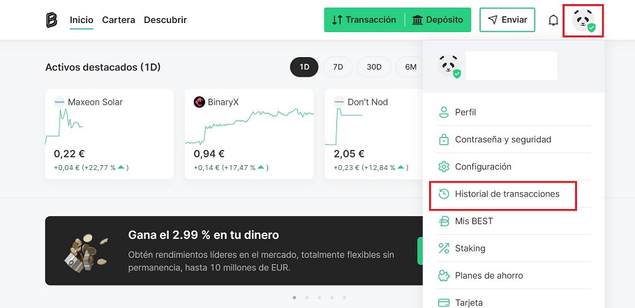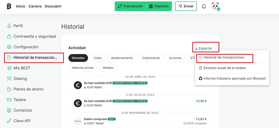 1. Dentro de Bitpanda navegue a la opción Cuenta >> Historial de transacciones (https://web.bitpanda.com/my-account/history)