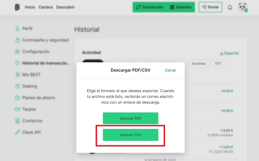4. Recibirá por correo electrónico un enlace al archivo de transacciones una vez generado. Cargue el archivo CSV dentro de TaxCripto (Bitpanda – Importar CSV).