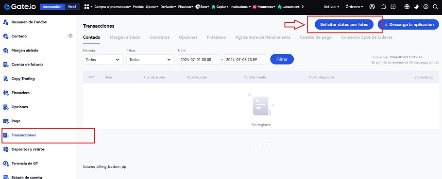 - Navegue en Gate.io a Cartera >> Transacciones (https://gate.io/myaccount/mypurselog) y pulse en «Solicitar datos por lotes».