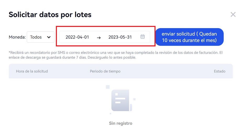 - Seleccione las fechas y pulse en enviar solicitud. Tenga en cuenta que Gate.IO solo permite descargas en tramos de 90 días y que solo se permiten 10 descargas al mes.