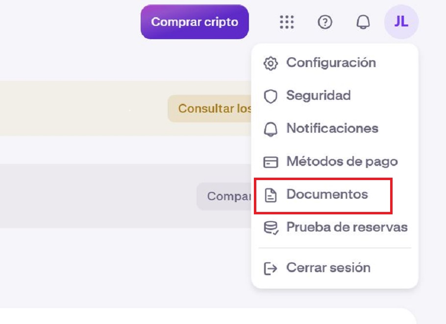 - Inicie sesión en su cuenta de Kraken y dentro de las opciones de usuario seleccione “Documentos”