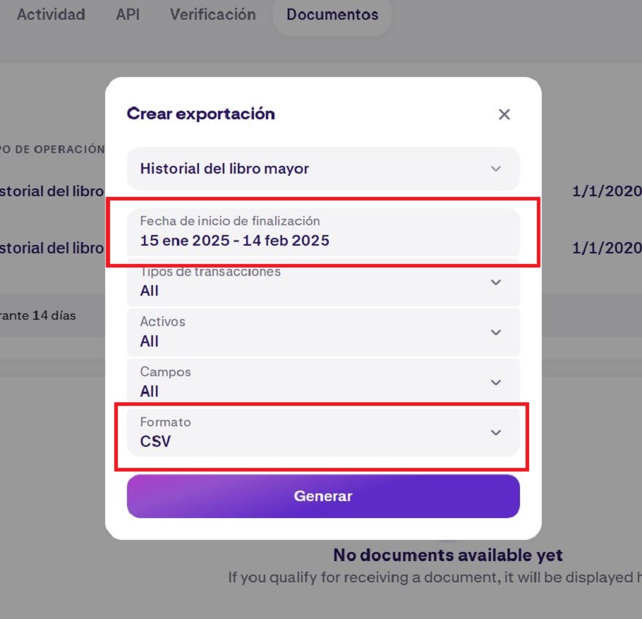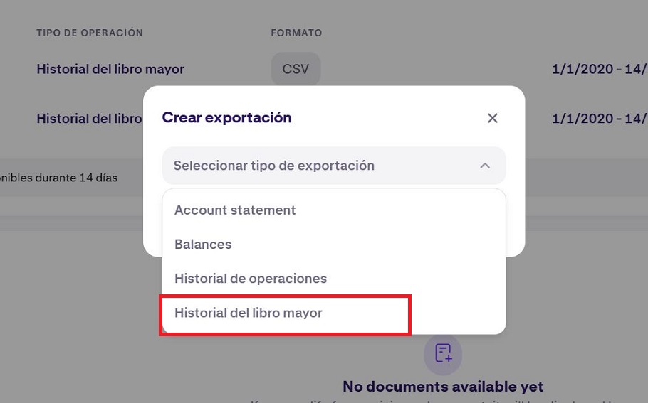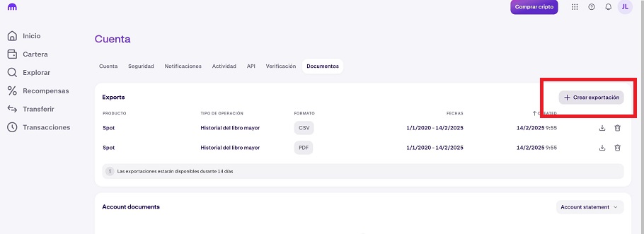 - Dentro de Documentos pulse en el botón «Crear exportación».